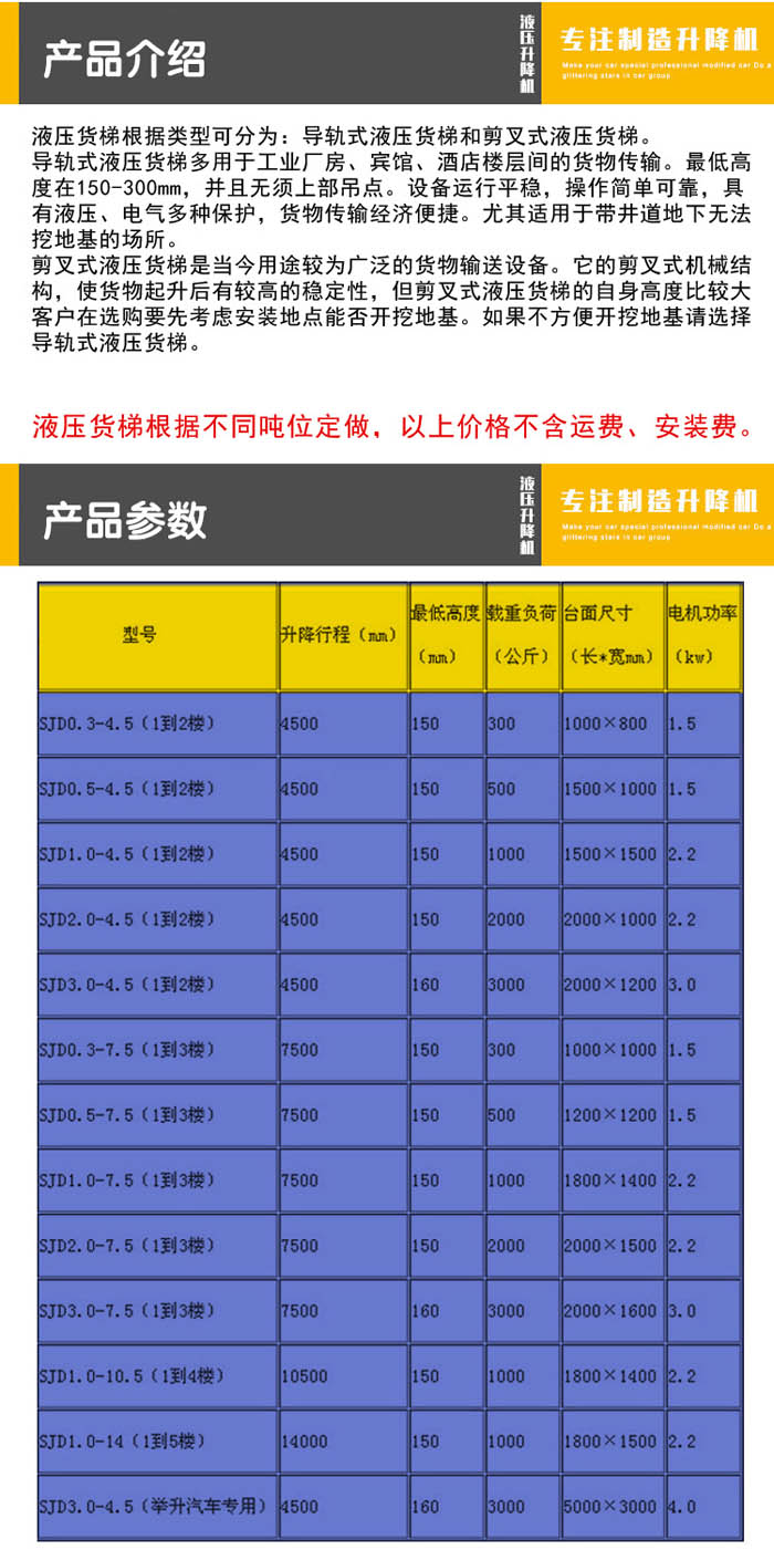 载重500KG导轨式升降平台主要用各种工作层间货物上下运送;立体车库和地下车库二层以上高楼间、无法开挖地坑场所。